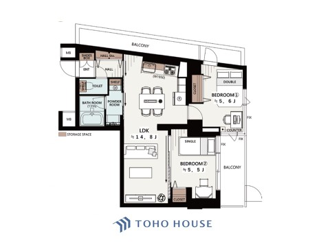 | 面積(平米) | 専有:57.19 バルコニー:8 | ||