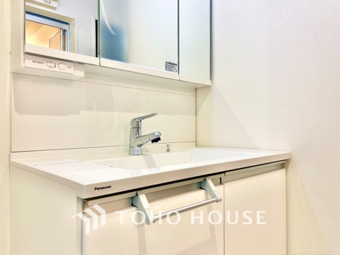 十分な大きさの洗面台は収納力大。身だしなみチェックや歯磨きなど、朝の慌ただしい時間でも余裕とゆとりを感じられる。