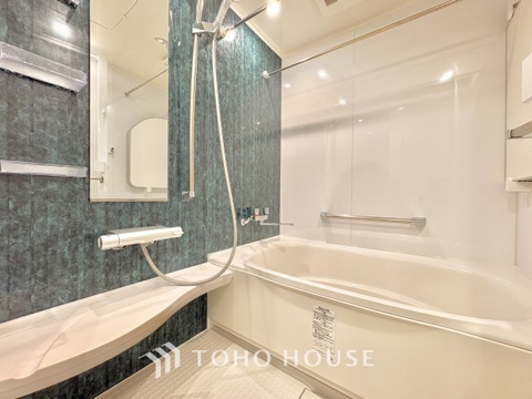 【浴室】《一日の疲れを落としてくれる場所は、落ち着く場所でなければならない》 高級感溢れるカラーと大きさ・柔らかな曲線で構成された半身浴も楽しめるバスタブが心地よさをもたらします。